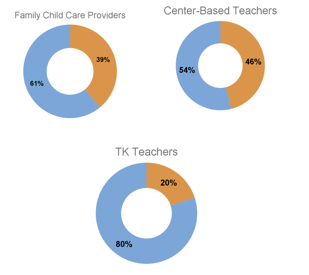 Close to three-fifths (59%) of California’s youngest learners are multilingual, meaning there are close to one million 0-5 multilingual learners in California. Californians Together partnered with the English Learner Workforce Investment Initiative (EL-WIN) to elevate the critical need for the child care workforce to honor the language, culture, and race of these students. The charts below show there is a large disparity between the proportion of multilingual learners and their multilingual educators. Yellow represents Multilingual teachers and providers while blue represents Monolingual teachers.